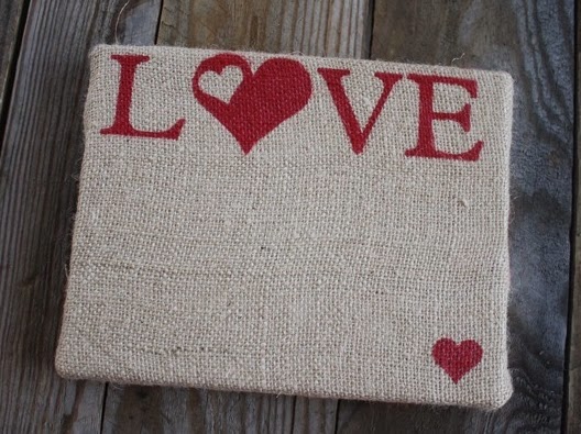 http://www.auntpeaches.com/2012/01/valentine-garland-from-plastic-grocery.htmlPainted Burlap Valentine’s Day Art
